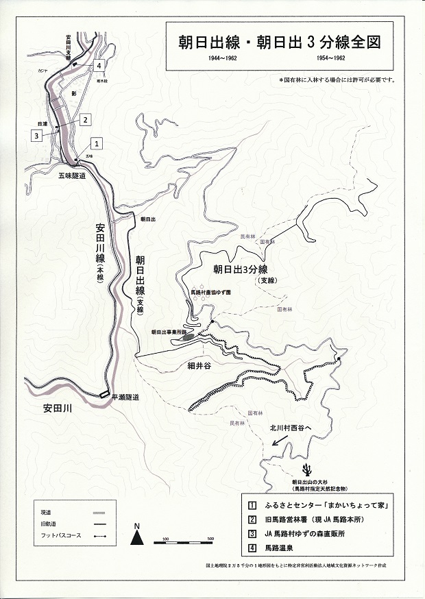 このコースの案内地図が出来上がりました。(朝日出線は1942年に敷設が始まり20年余り木材搬出に利用されていましたが1962年に廃止になっています)