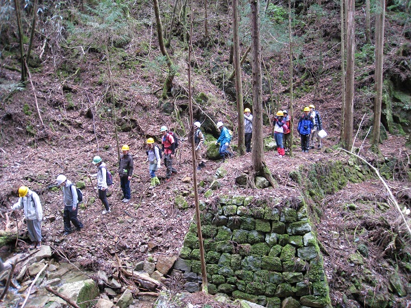 当日は、天気もよく山間に眠る石積や橋台跡などをゆっくり見て回り、「自然あふれるコース。気持ちがいい」などの評価うけましたが、反面、安全管理面で色々と指摘もうけましたので、27年度に指摘をうけたところを改善し、秋ごろから森林管理署の入林許可をとってガイド付きで一般公開出来るようにしたいと思っております。