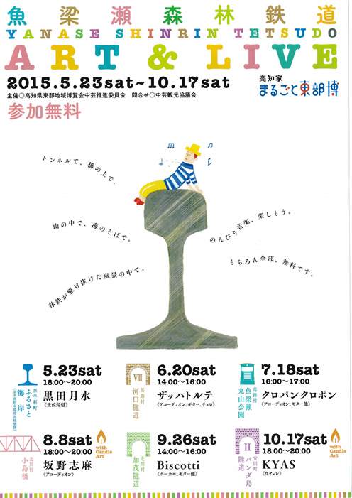 5月より毎月開催している「まるごと東部博”魚梁瀬森林鉄道鉄道アート&ライブ”」の7月開催は、馬路村魚梁瀬の丸山公園にある魚梁瀬保存森林鉄道駅舎前で行います。