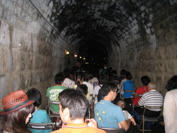 3人のリズミカルで一体感のある演奏と、トンネル独特の音響効果があいまって迫力ある演奏会となり150人が酔いしれた。